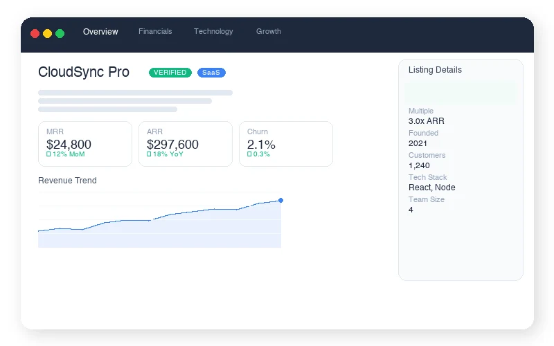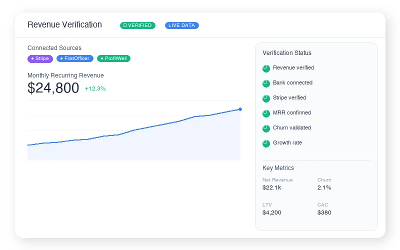 We use FirstOfficer to verify the revenue of our listings. Sellers directly connect their billing provider to GetAcquired, and we build real time, hyper accurate metrics & charts.